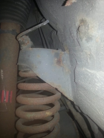 Bij het verwijderen van de linker voorveer, die was gebroken, bleek er een scheurtje in de ophangbeugel van de veer te zitten. We hadden er verder nog niet naar gekeken.